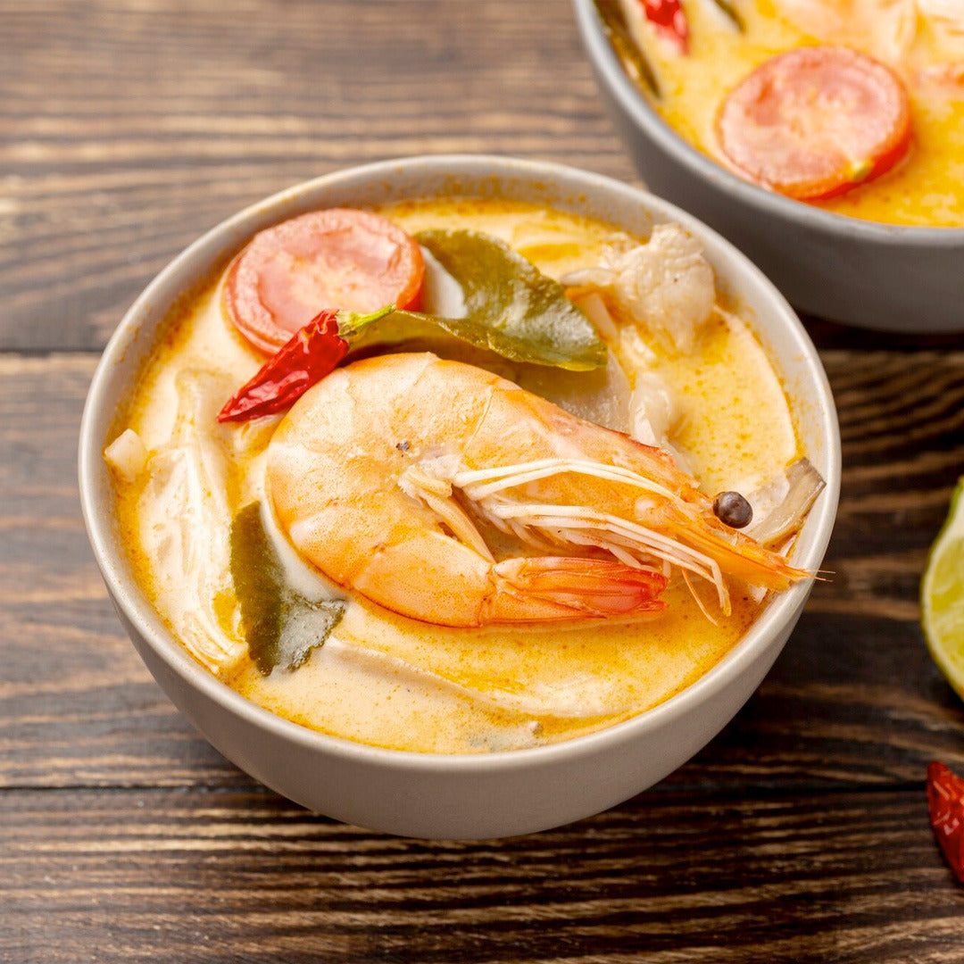 - Panaskan kembali kaldu udang, lalu masukkan tumisan bumbu pasta tom yum ke dalamnya.