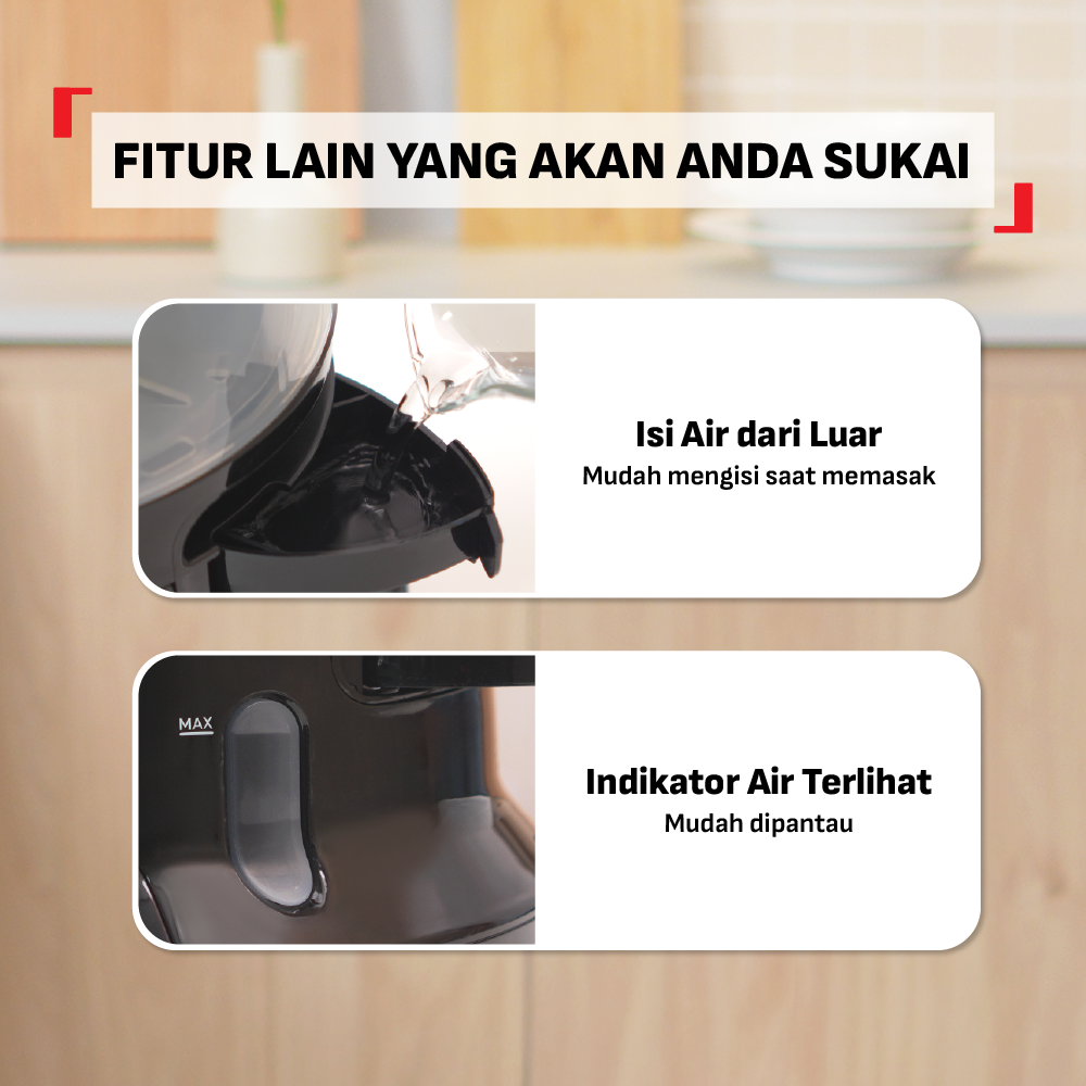 A 6L capacity food steamer that is suitable for various steamed recipes. Steam various foods at one time with its 3 (three) containers. The Food Streamer Ultra Compact is also equipped with: